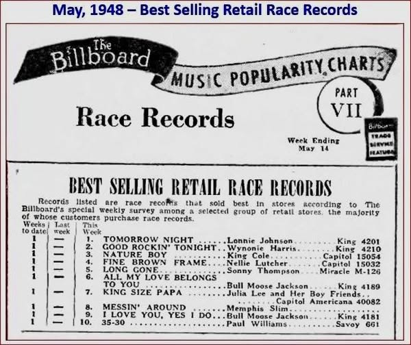 In 1948, Louis Jordan had just two entries on the chart; the rest of the entries were taking Race Records in a new direction, thanks largely to the new independent companies. King Records, founded in Cincinnati in 1943 by Syd Nathan, had six entries. Miracle Records, established in 1946 in Chicago by Lee L. Egalnick, had three singles at number one on the Race Records chart during 1948. They all made the Top of the Year chart and one of them, “Long Gone”, was the year’s most successful release, topping the Top of the Year chart. Capital also had three entries, with Julia Lee and Nellie Lutcher again, plus Nat King Cole. Other independent labels to make the Top chart were 4 Star, Savoy, Modern, National, Mercury, Specialty, Natural and Bullet. The industry had changed and so had the music. Many of these independents were set up to promote Black artists, many of them heading towards Rhythm & Blues.